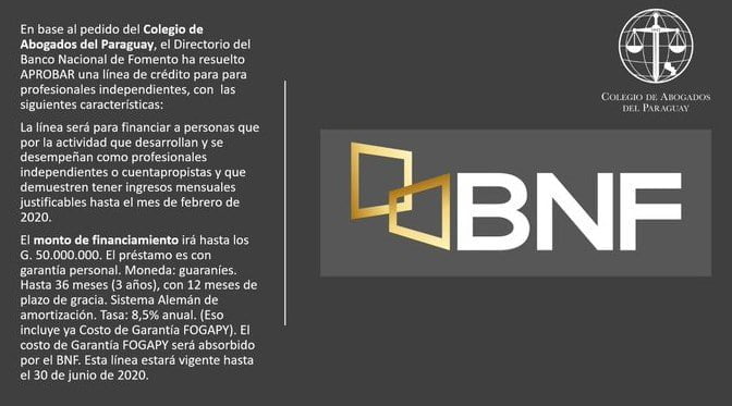 BNF otorgará créditos: Tras el pedido del Colegio de Abogados del Paraguay, el Banco Nacional de Fomento pone a disposición líneas de créditos para profesionales independientes y cuentapropistas.