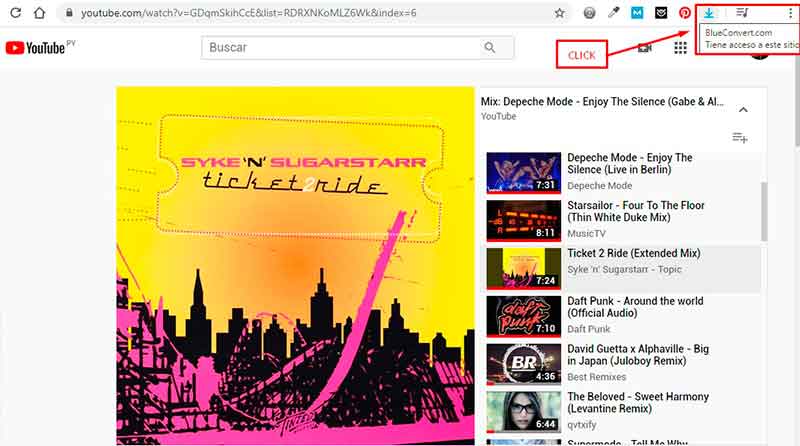BlueConvert extensión para Google Chrome Youtube Video Ripper (Audio – Video Formats) descárgate todos los vídeos de Youtube